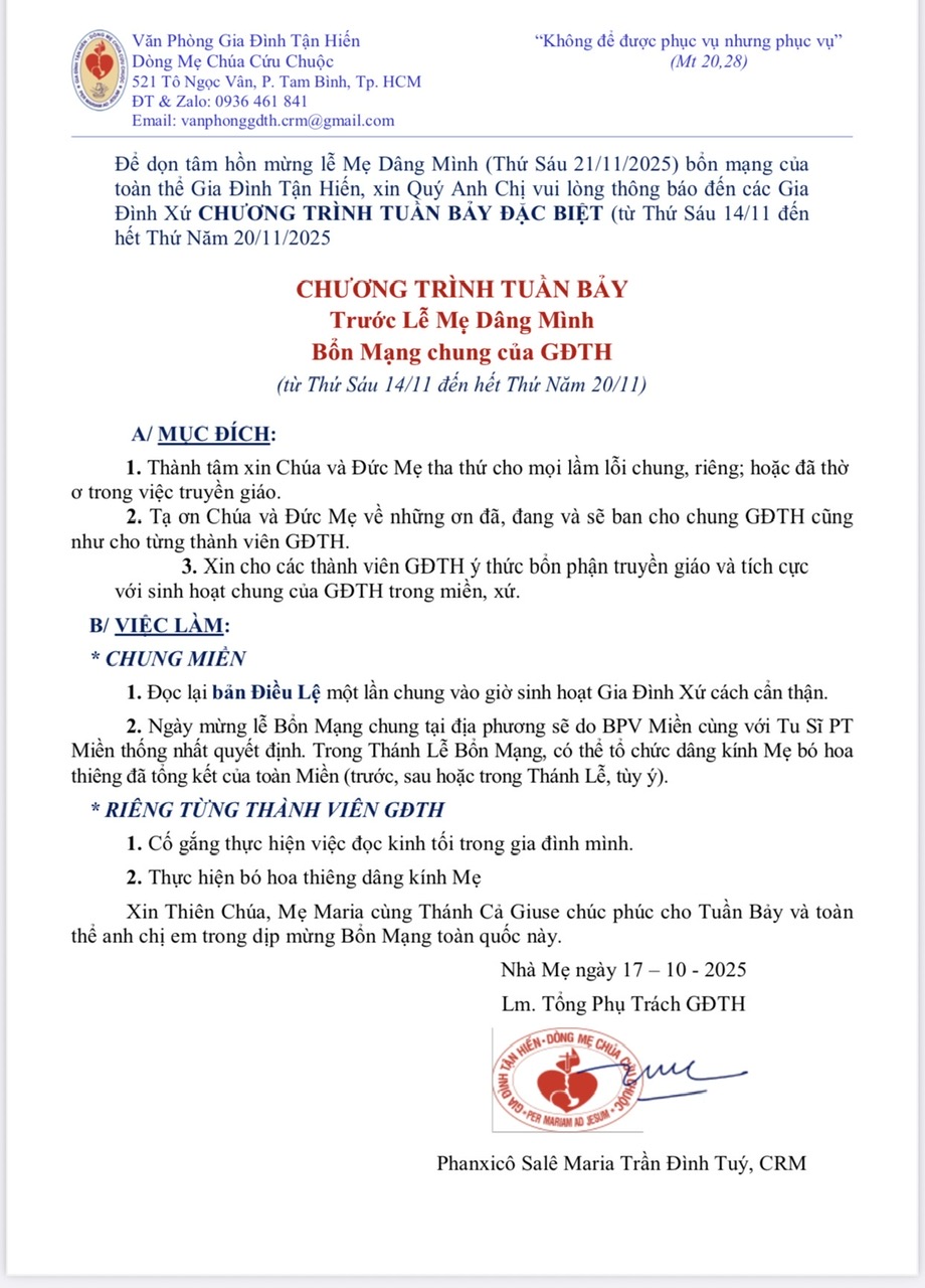 CHƯƠNG TRÌNH TUẦN BẢY TRƯỚC LỄ MẸ DÂNG MÌNH 21-11-2025