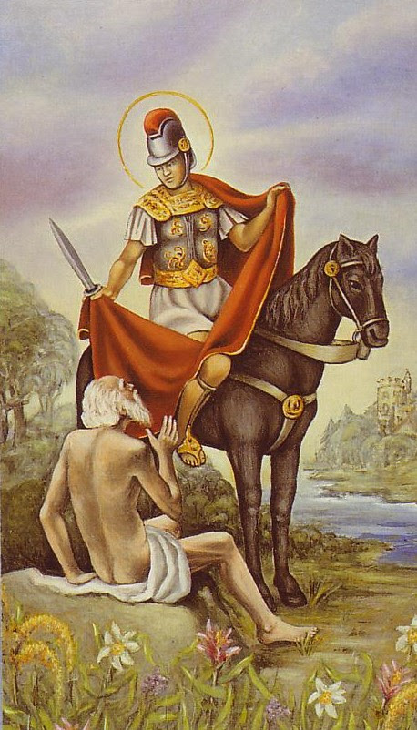 khi đã chia cắt một phần áo choàng cho người ăn xin bên vệ