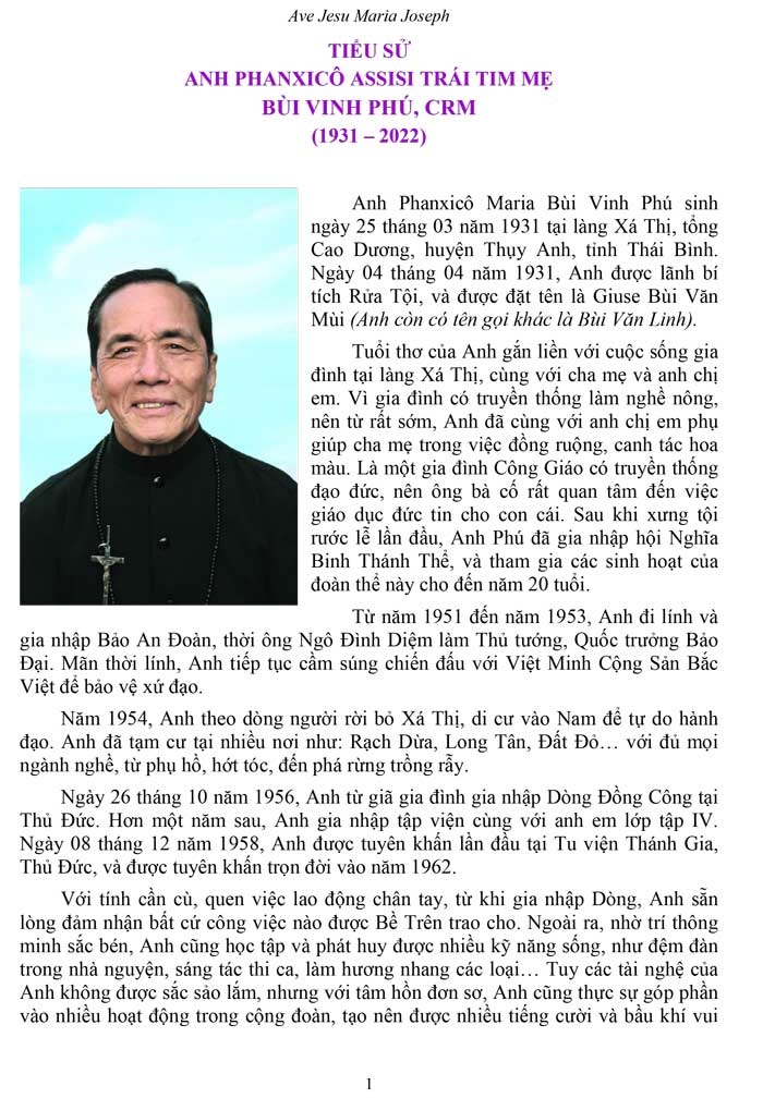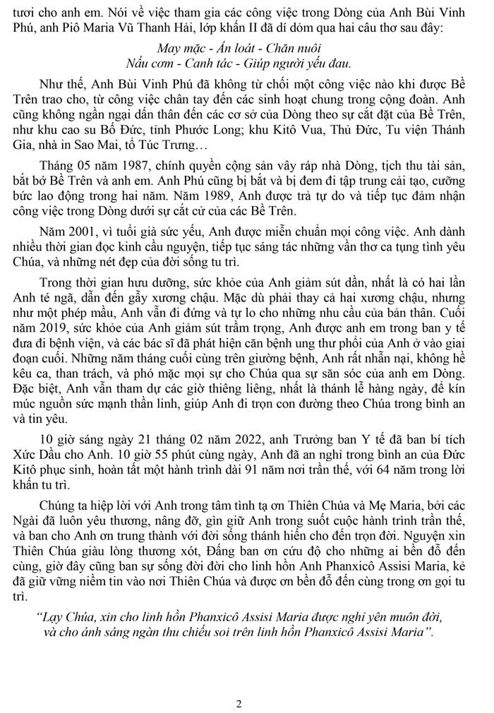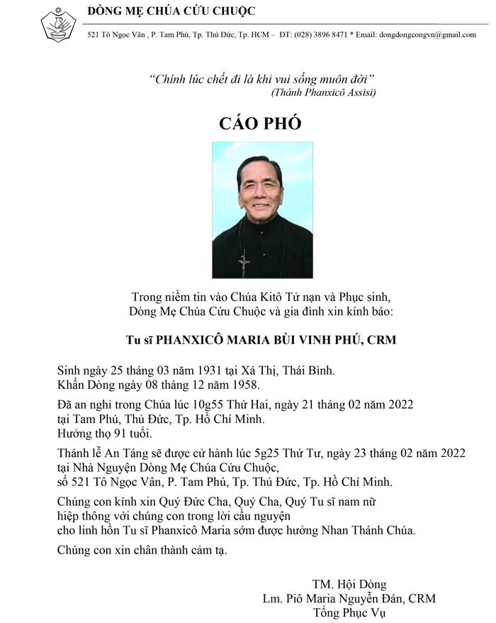 VN lẫn Tỉnh Dòng HK, cầu nguyện cho người anh CRM mới ra đi
